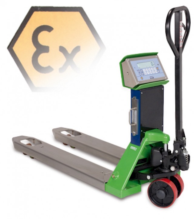 Porta paletes com pesagem electrónica integrada, adequado para áreas perigosas classificadas como zonas de risco de explosão (ZONA 2 e 22), com modo de protecção segundo Ex II 3GD IIC T6 T130°C X.